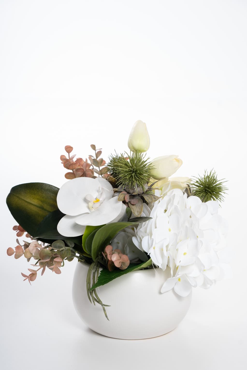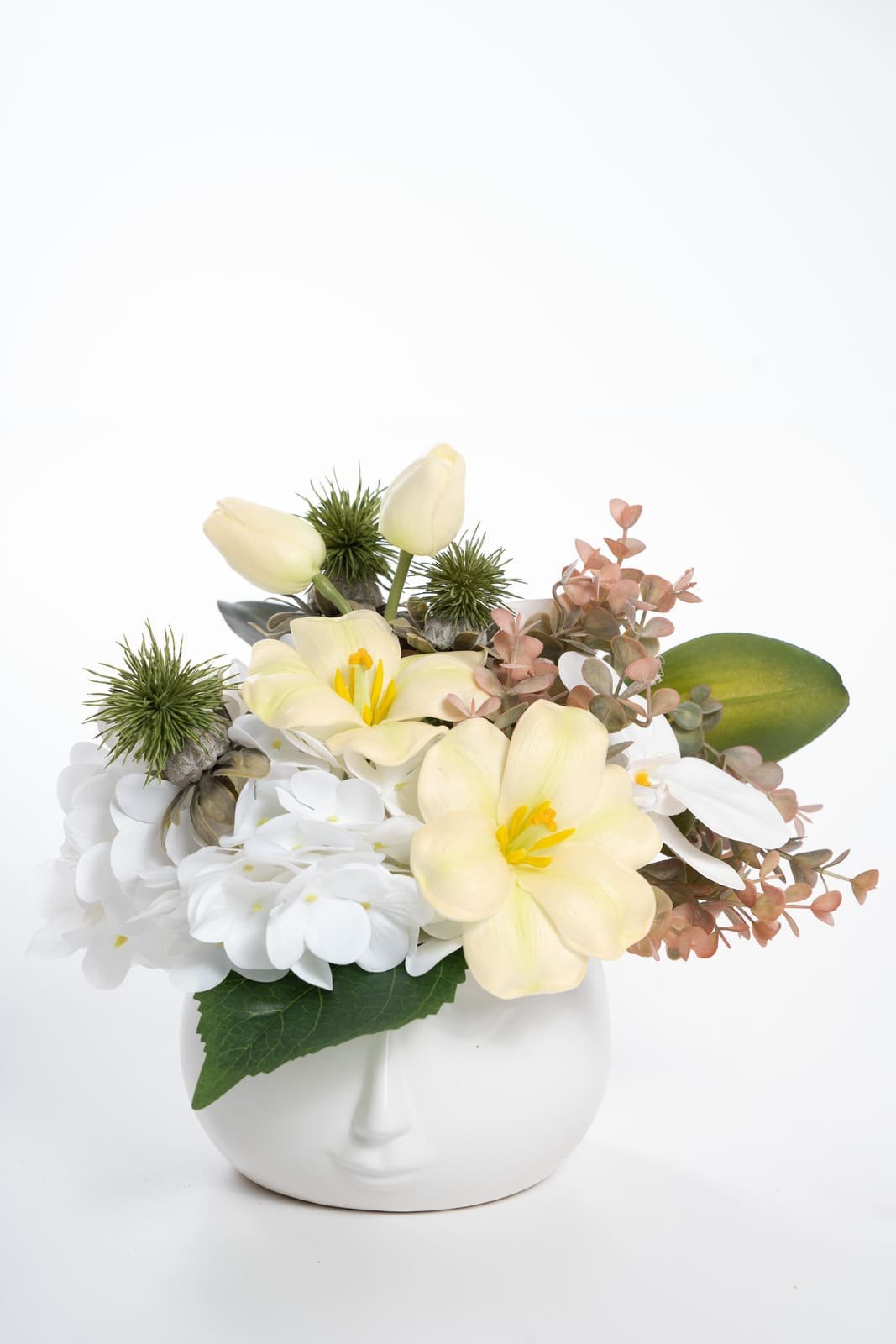 Išskirtinė vaza ir švelnaus atspalvio gėlės suteikia lengvumo ir natūralumo. Atrodo taip natūraliai, kad net nesuprasite, jog čia dirbtinės gėlės. O geriausias dalykas, kad nereikalauja jokios priežiūros!